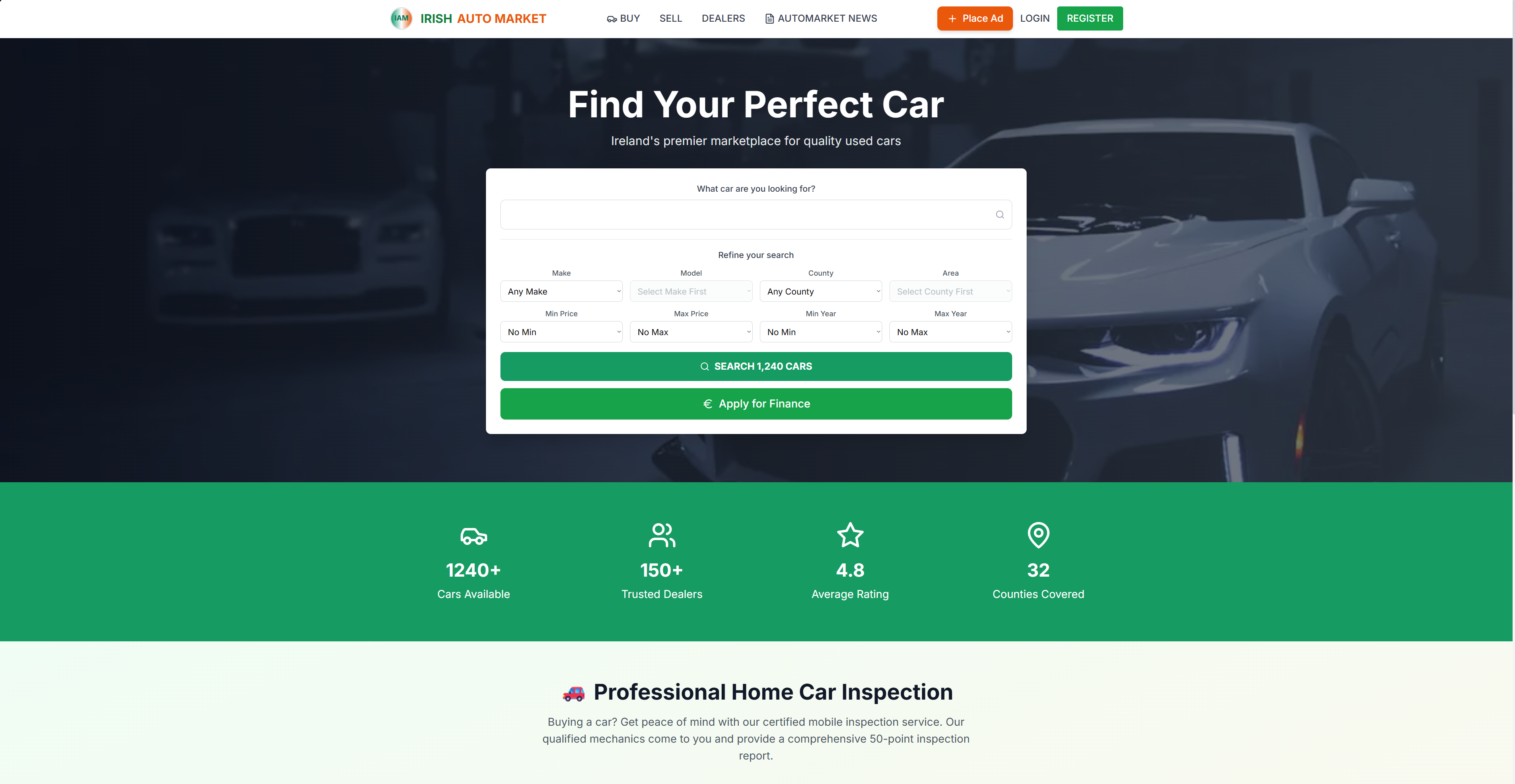 Met with the client to understand their vision and built a full-scale car marketplace serving buyers, sellers, and dealers across all 32 Irish counties. Integrated a finance application flow and a 50-point mobile inspection service with real-time booking. Now serving 50+ registered dealers and over 1,000 listed vehicles.